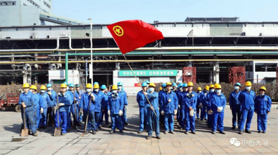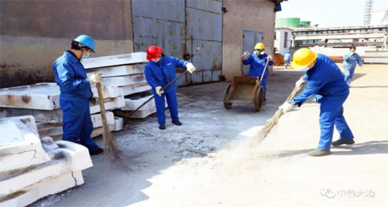 中色大冶冶煉廠團(tuán)員青年對相關(guān)區(qū)域的衛(wèi)生和含銅物料進(jìn)行清理、回收