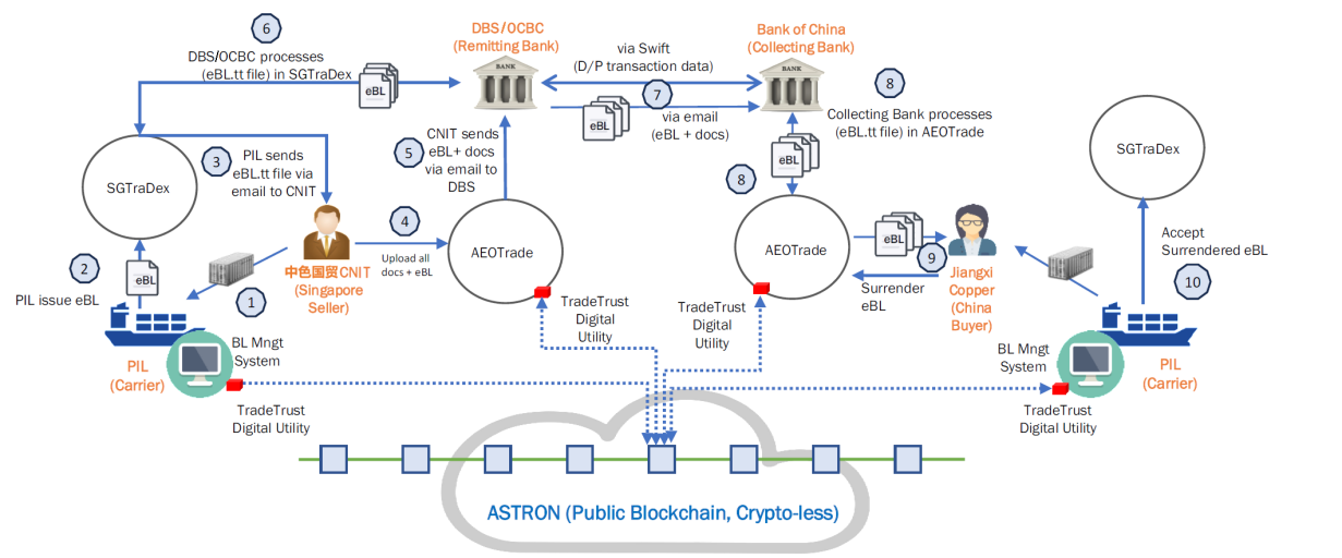 二是驗證可行性,掌握電子提單“試金石”。驗證了電子提單在銅產(chǎn)品貿(mào)易中的可行性,通過基于信貿(mào)鏈和TradeTrust的平臺進行單據(jù)真實性核驗,代收行通過平臺直接驗單,并能夠在線進行權(quán)屬轉(zhuǎn)移,顯著提升跨境貿(mào)易融資安全性與效率。