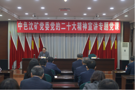 11月17日,按照集團(tuán)公司黨委統(tǒng)一部署,中國(guó)有色集團(tuán)出資企業(yè)沈陽(yáng)礦業(yè)投資有限公司(簡(jiǎn)稱:中色沈礦)黨委召開(kāi)黨的二十大精神宣講專(zhuān)題黨課會(huì)議,中色沈礦黨委書(shū)記、董事長(zhǎng)王鎖寬以《以二十大精神為行動(dòng)綱領(lǐng) 、推動(dòng)沈礦綠色高質(zhì)量發(fā)展,凝心聚力在新征程中展現(xiàn)新?lián)?dāng)貢獻(xiàn)新力量》為題,為全級(jí)次廣大黨員干部講授專(zhuān)題黨課,宣貫黨的二十大精神,對(duì)走好走穩(wěn)中色沈礦綠色高質(zhì)量發(fā)展之路作出部署,并就學(xué)習(xí)落實(shí)好二十大精神提出要求。
