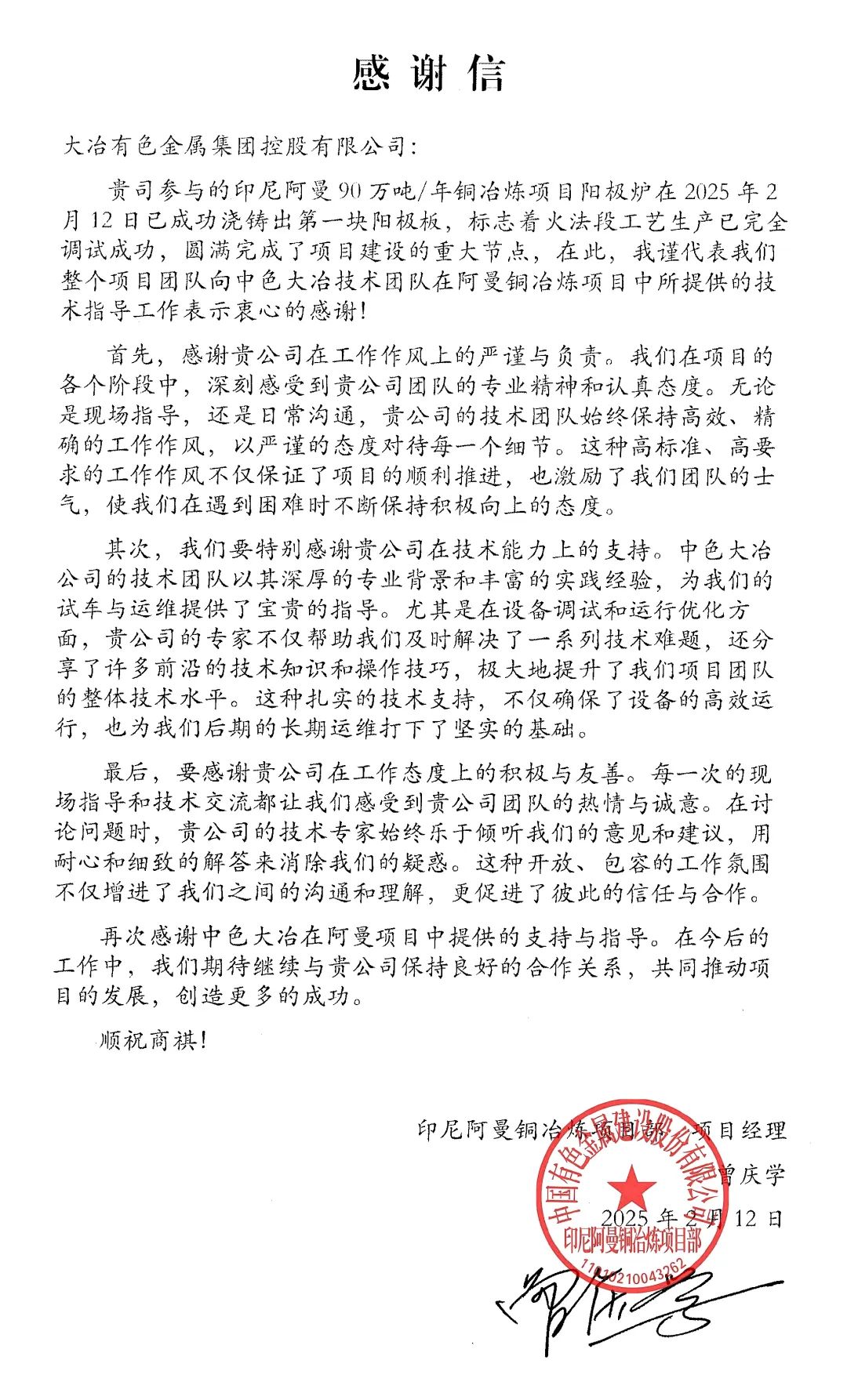 這是印尼阿曼銅冶煉項目成功澆鑄出第一塊陽極板后,中國有色金屬建設股份有限公司(以下簡稱“中色股份”)印尼阿曼銅冶煉項目部經(jīng)理發(fā)給公司的《感謝信》,對公司派駐印尼阿曼項目部管理技術團隊嚴謹負責的工作作風、扎實豐富的技術經(jīng)驗和積極友善的合作精神給予充分肯定。